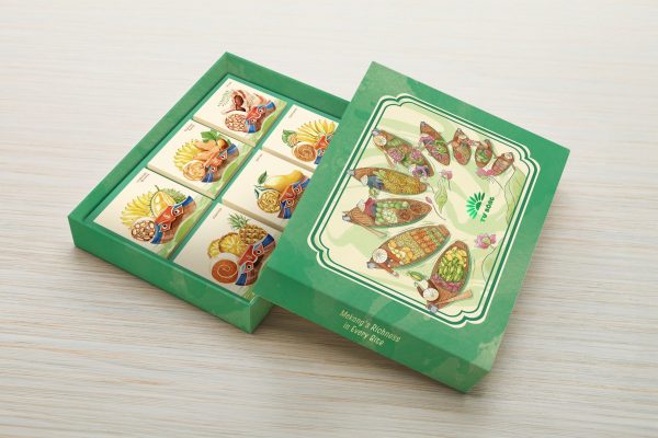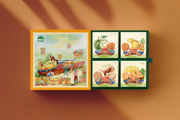 Hộp quà có khối lượng ~1.3kg với thiết kế cánh lật tiện lợi đơn giản cho việc trưng bày và sử dụng. Bên trong là 9 sản phẩm của Tư Bông từ những sản phẩm truyền thống quen thuộc như chuối cuộn đậu phộng, chuối cuộn mè đến những sản phẩm mới được Tư Bông phát triển đặc biệt cho mùa Tết này như xoài cuộn muối ớt, xoài cuộn cam…