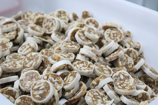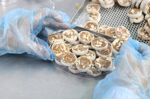 Từng cuộn kẹo được phết nhân, cuộn tay từng cái một, sau đó cắt lát đều, ép nhẹ để định hình. Cuối cùng là bước đóng gói – bằng túi hút chân không hoặc hộp oval cao cấp, vừa sạch sẽ vừa tiện mang đi xa.