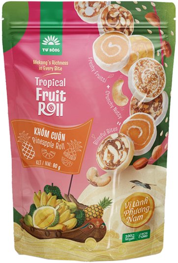 | Khóm cuộn hạt điều | 50g | Khóm 70%, hạt điều, đường, bánh phồng | Túi zipl – vị béo nhẹ, lạ miệng |