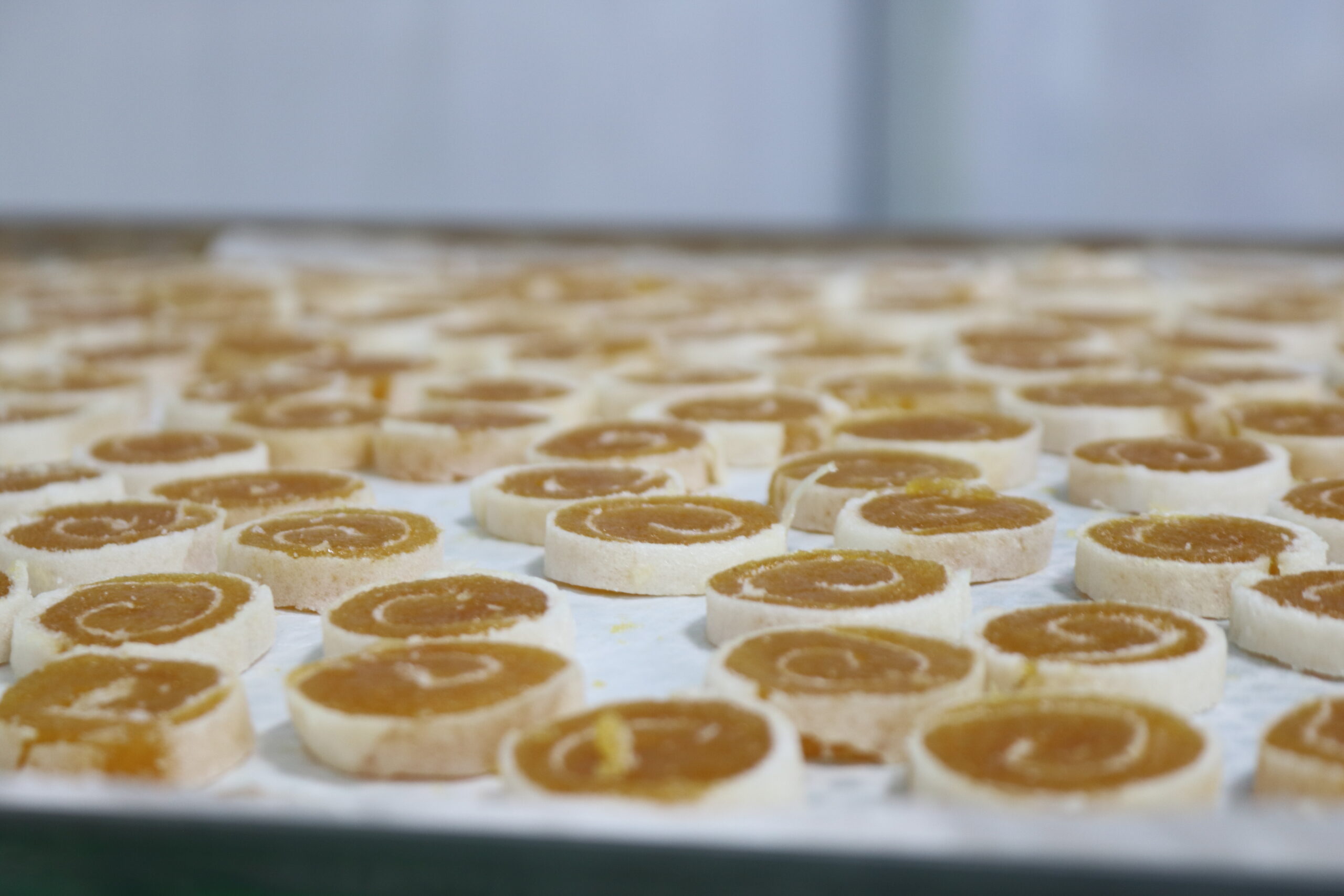 Sau đó là phần bánh phồng – loại được nướng vàng nhạt, đủ giòn nhưng không gãy. Lúc cuộn, người thợ phải phết nhân đều tay, cuộn đúng lực để không quá chặt cũng không lỏng. Cuối cùng là cắt lát – ép định hình – đóng túi hút chân không hoặc xếp vào hộp oval.