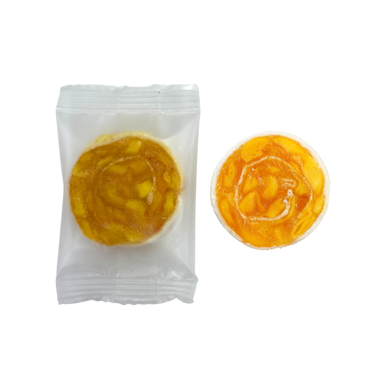 Fruzza Mango Roll with Orange combines the rich aroma of ripe mango with the light sweetness of juicy orange. The smooth, chewy mango layer is wrapped around gently cooked orange, creating a balanced texture with mild sweetness and natural citrus acidity. The result is a fresh, pleasant flavor that is easy to enjoy without being heavy.