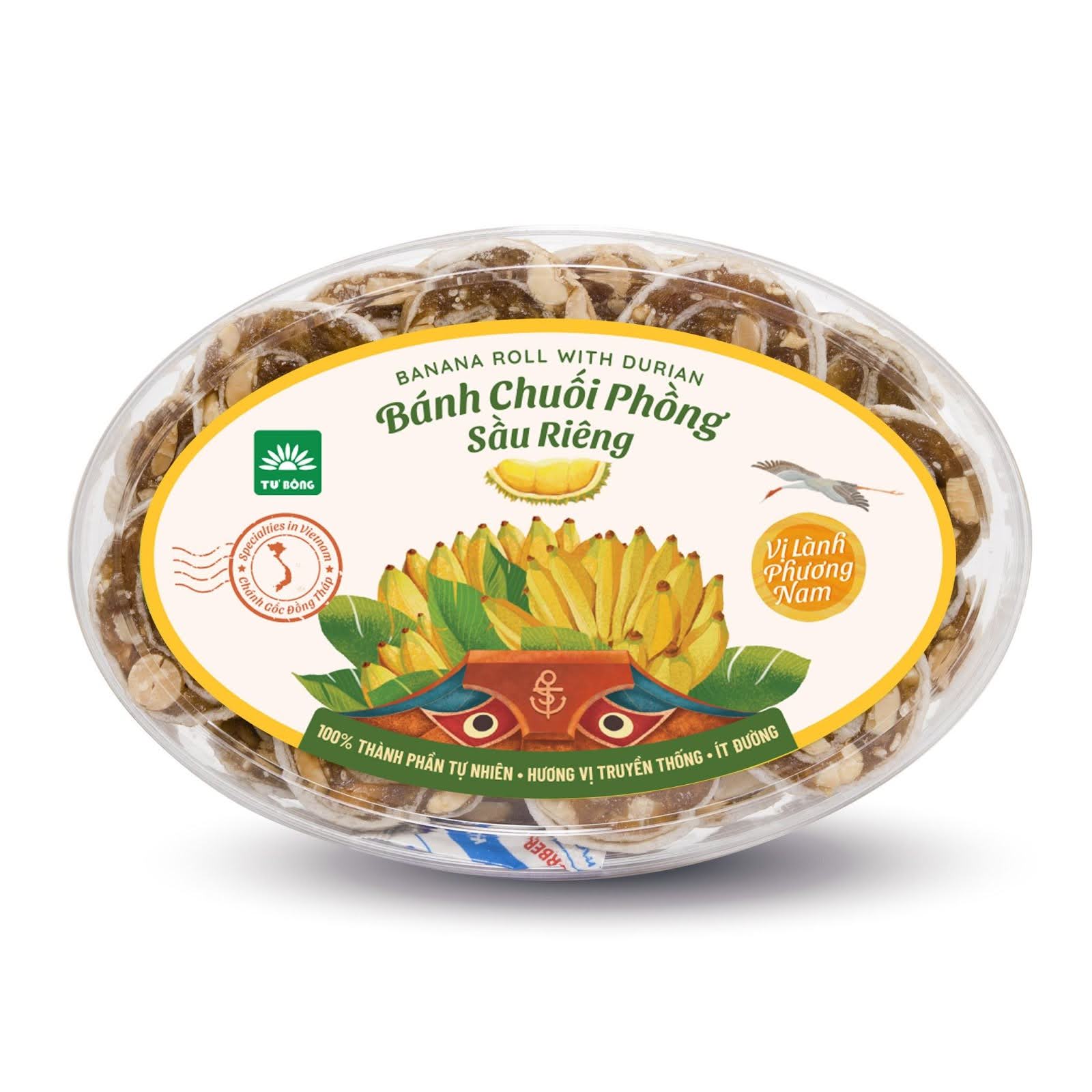 Trái cây cuộn là dòng sản phẩm thủ công nổi bật của Tư Bông – thương hiệu chuyên về các loại bánh kẹo mang hồn quê. Món bánh này là sự kết hợp hài hòa giữa bánh phồng nếp truyền thống và lớp nhân được làm từ trái cây chín như chuối, khóm (thơm), mãng cầu, xoài, me… Từng cuộn bánh là một sự gói ghém tinh tế từ vị chua thanh, ngọt dịu đến hương thơm nhẹ nhàng đặc trưng.